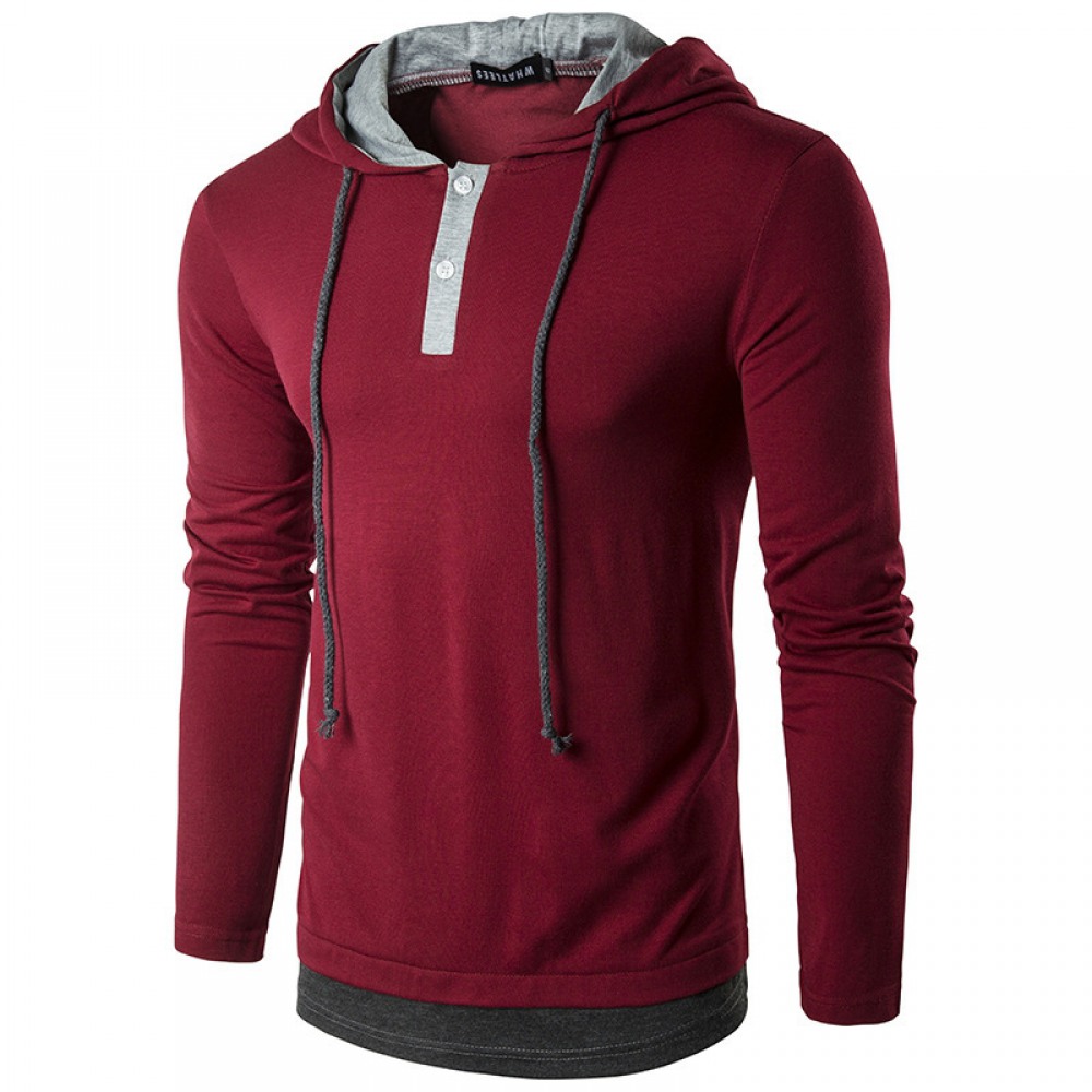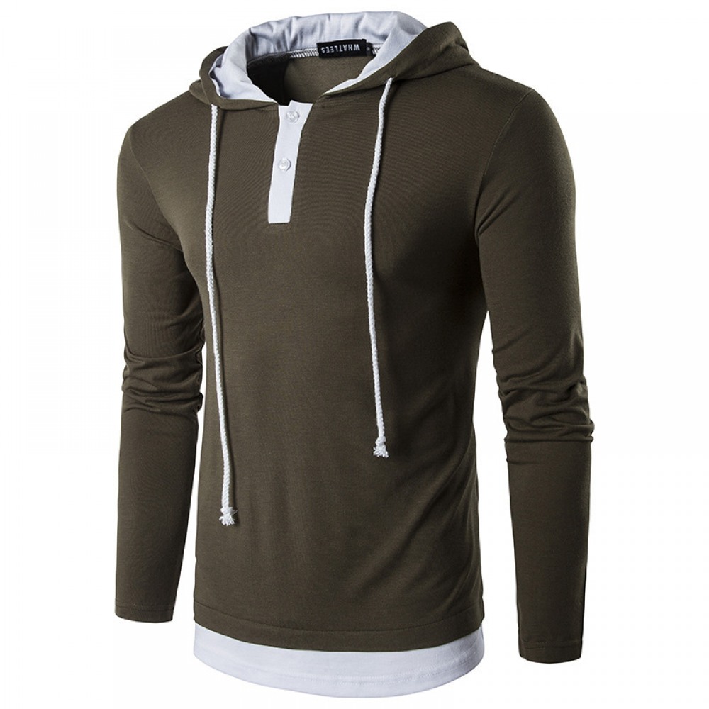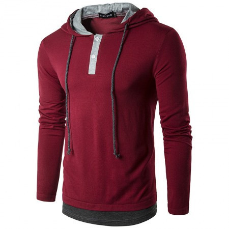 New Men's Fashion Street High Street Style Fake Two-Piece Hooded Drawstring Long-Sleeved T-Shirt